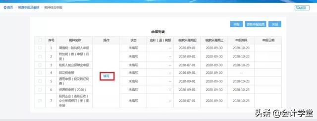 系统自动列出当期支持税种范围内的应申报的税种,点击“填写”,进入申报表填写页面。