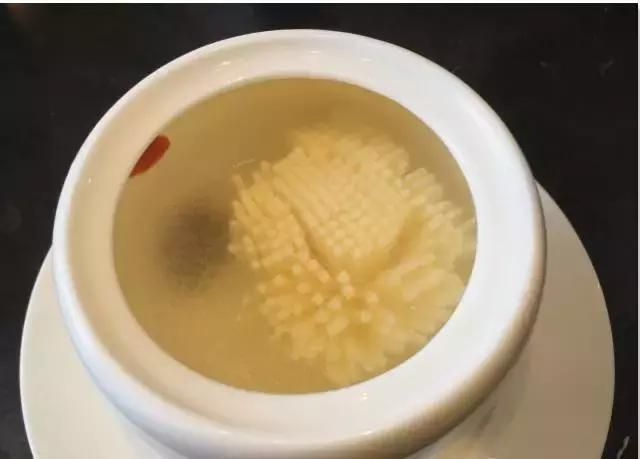 这道豆腐羹,切工实在是好,长短薄厚都十分均匀,温和清淡。
