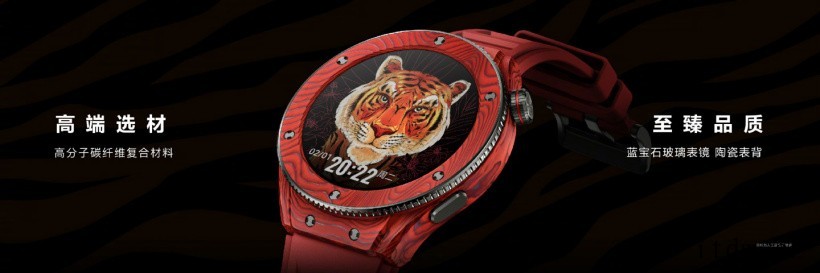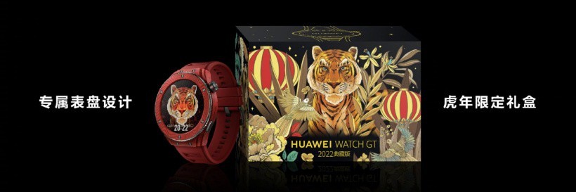 华为 WATCH GT 2022 典藏版分为亮黑、朱红两款配色,采用了虎年专属设计,拥有虎年专属定制表盘、虎头旋转表冠、虎牙造型表带透气孔。