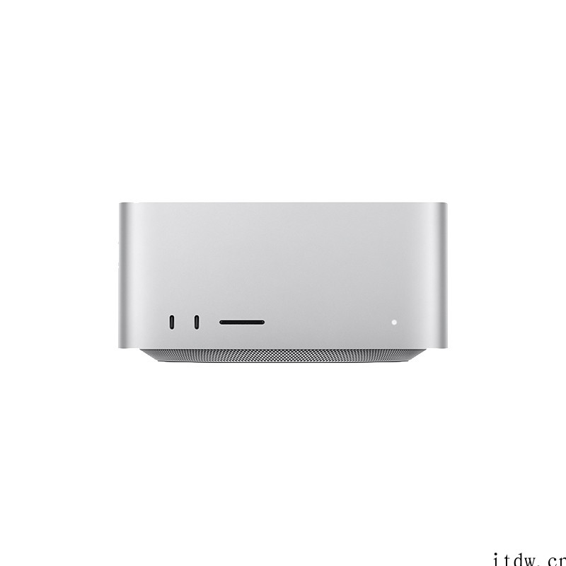 设计方面,Mac Studio 机身采用铝金属压制一体成型工艺,底边长仅 7.7 英寸(约 195.58 毫米),高仅为 3.7 英寸(约 93.98 毫米),整体外观小巧玲珑,可以轻松置于多数显示器下方。