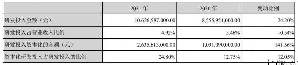 IT大王了解到,比亚迪 2021 年研发投入金额 106.26 亿元,同比增长 24.2%,占总营收的 4.92%。