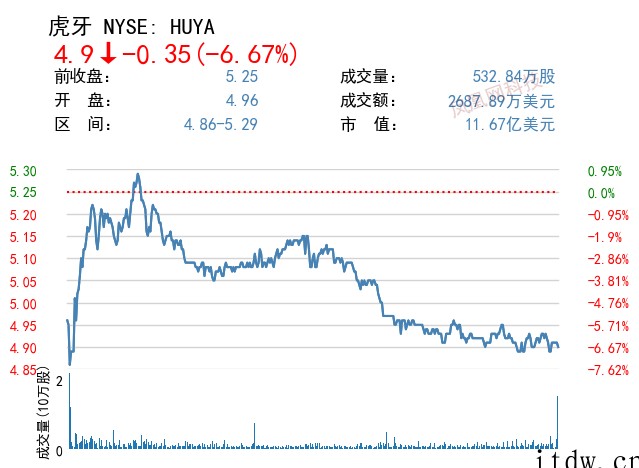 ▲ 虎牙股价一度探底 4.83 美元 跌幅达到 8%
