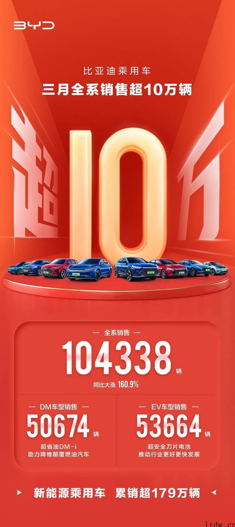 比亚迪销量数据显示,今年 3 月插混车型销量为 5.07 万辆,同比增长 615.2%,纯电销量 5.37 万辆,同比增长 229.2%。