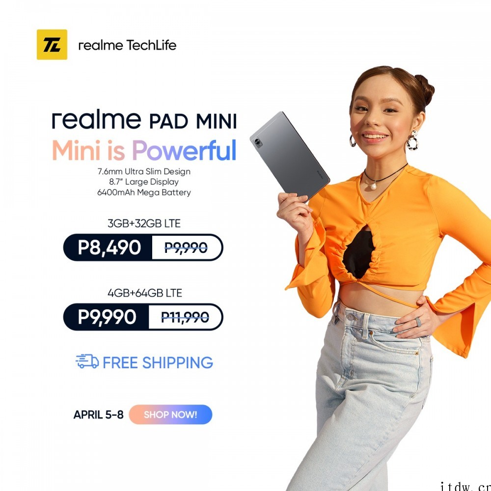 IT大王 4 月 4 日消息,realme Pad Mini 现已在菲律宾市场正式上市,采用一块 8.7 英寸的 LCD 屏,分辨率为 1340 x 800,搭载紫光展锐 T616,支持 4G 网络、 Wi-Fi 802.11 a / b / g / n / ac 和蓝牙 5.0。