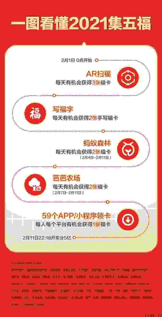 IT大王2月1日消息 支付宝钱包今日公布,2021 集五福早已开始了。2020年除开 AR 扫福、蚂蚁森林能量、芭芭大农场之外,每日写福字还能多得 2 张福卡,并且卡上便是你自身写的福。此外,不但支付宝钱包,一共 59 个 App 或微信小程序都能够领取福卡。