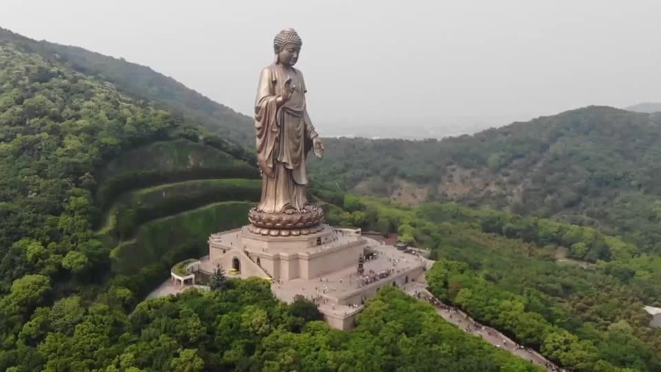 今天来到无锡的灵山大佛门前,门票210元先用无人机拍视觉效 非常大气壮观,而梵宫更给人惊艳,大佛在灵山上俯视万千生灵。无锡灵山大佛蠡湖公园+宁波南塘老街普陀山祈福至尊纯玩休 大佛右手指天,称为“施无畏印”,那是大佛在为众生除去痛苦。