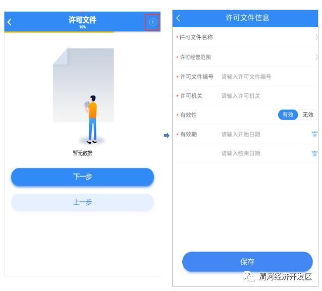 填报许可文件信息。点击“+”按钮即可填写相关许可文件详细信息,填写完成后点击“保存”。如下图: