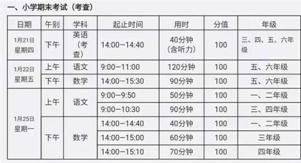 渝中区教委公布的《小学期末考试(考查)》显示,渝中区小学的期末开始时间为1月21日至1月25日,其中,3-6年级英语(考查)统一在1月21日下午进行,高年级(5、6年级)的期末考试在1月22日举行,低年级(1-4年级)1月25日举行。
