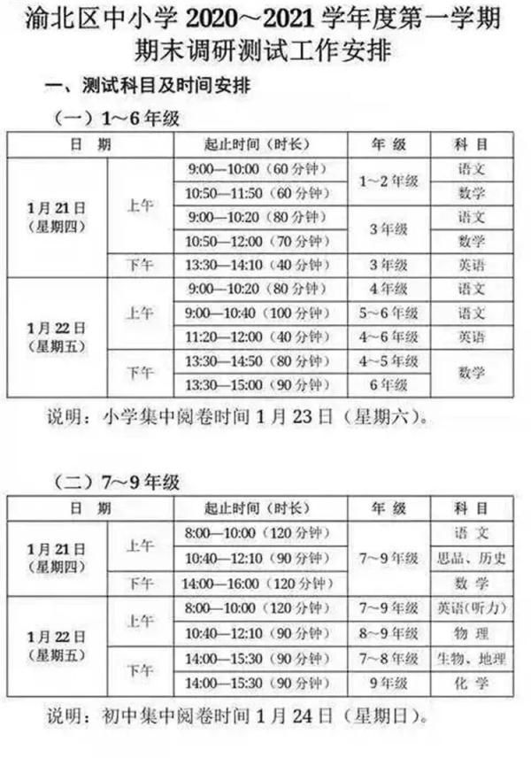 根据《渝北区中小学2020-2021学年度第一学期期末调研测试工作安排》,渝北区小学、初中的期末测试都集中在1月21日至1月22日进行。其中,小学1-3年级1月21日举行,4-6年级1月22日举行;初中1月21日举行语文、数学、思品、历史考试,1月22日举行英语、物理、生物、地理和化学考试。