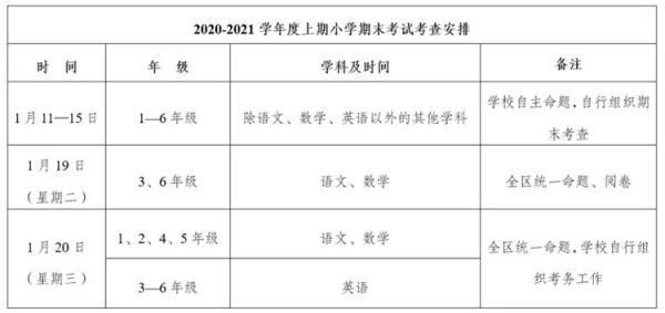 《高新区2020-2021学年度上期小学期末考试考查安排》显示,该区小学的期末考试时间为1月19日到1月20日。具体为:3、6年级的语文、数学考试在1月19日举行,3、6年级的英语和1、2、4、5年级的语文、数学在1月20日举行。