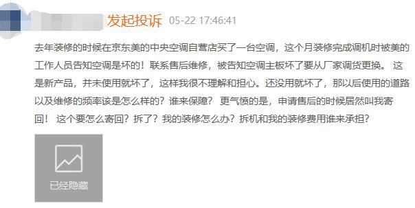 而下面这位消费者遇到的问题更窝心。该消费者在黑猫投诉上表示,去年装修时在京东美的中央空调自营店买了一台空调,今年5月份装修完成调机时被美的工作人员告知空调是坏的!联系售后维修,被告知空调主板坏了要从厂家调货更换。该消费者联系售后,售后要求其将空调寄回,但消费者已将空调安装完成。