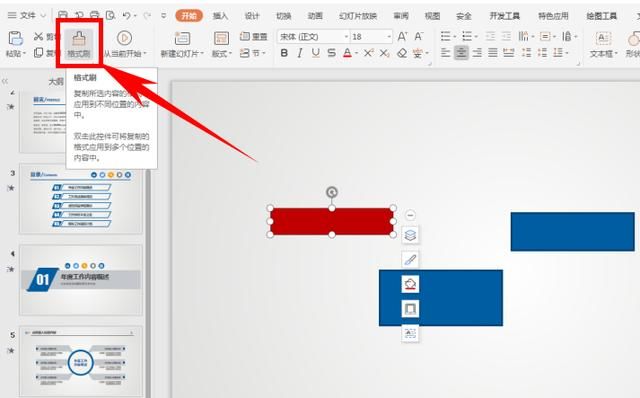 这时,如果需要将其他两个图形设置为相同格式,则单击工具栏【开始】下的【格式刷】,设置一个单击一下,如果设置多个图形,则双击格式刷,如下图所示: