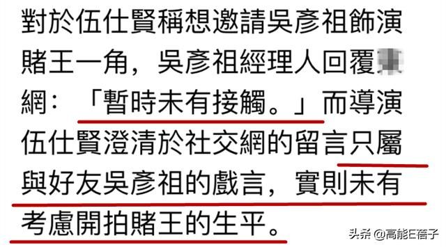原来,在赌王离世后不到24小时,美籍华人导演伍仕贤就在社交平台公告要开拍赌王传电影,还艾特吴彦祖演赌王。