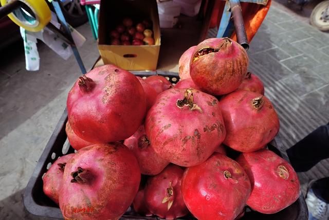 喀什东门大巴扎石榴。石榴原产地为伊朗,张骞凿空西域后,石榴经新疆(西域)传入内地。