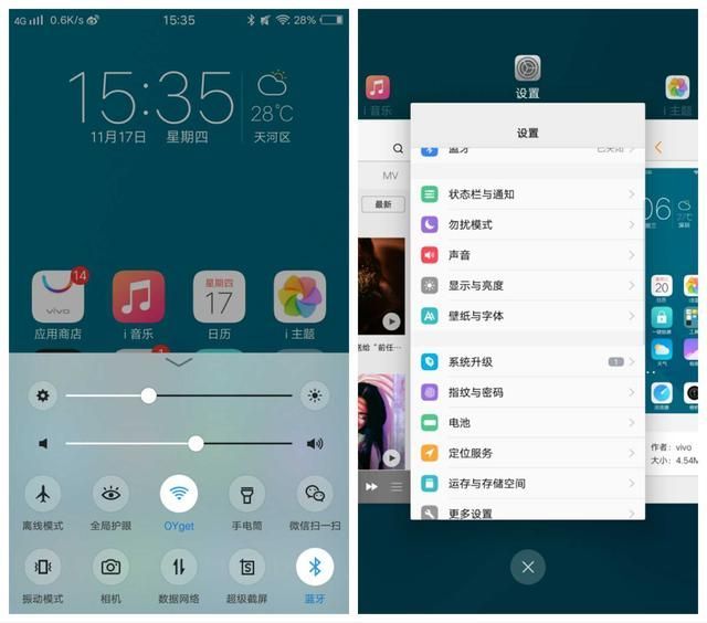 终于,vivo不再坚守保留一颗菜单按键了,机身底部最最下角的按键不再是很鸡肋的菜单功能,与大多其他手机一样,vivo把它设置成了多任务键,原来的底部上滑功能仍得到了保留,只是单纯作为控制中心,用于调节亮度、音量,以及快捷开关。